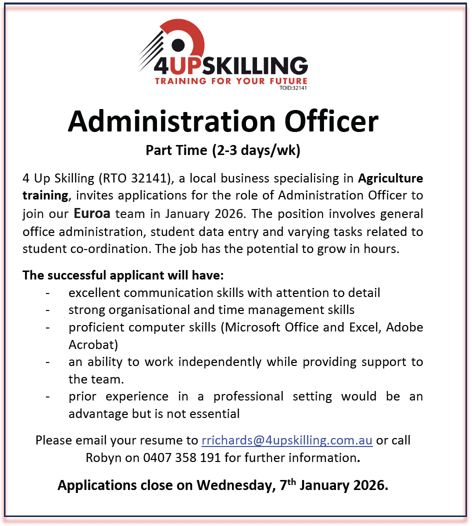 Email your resume to rrichards@4upskilling.com.au or call Robyn on 0407 358 191
